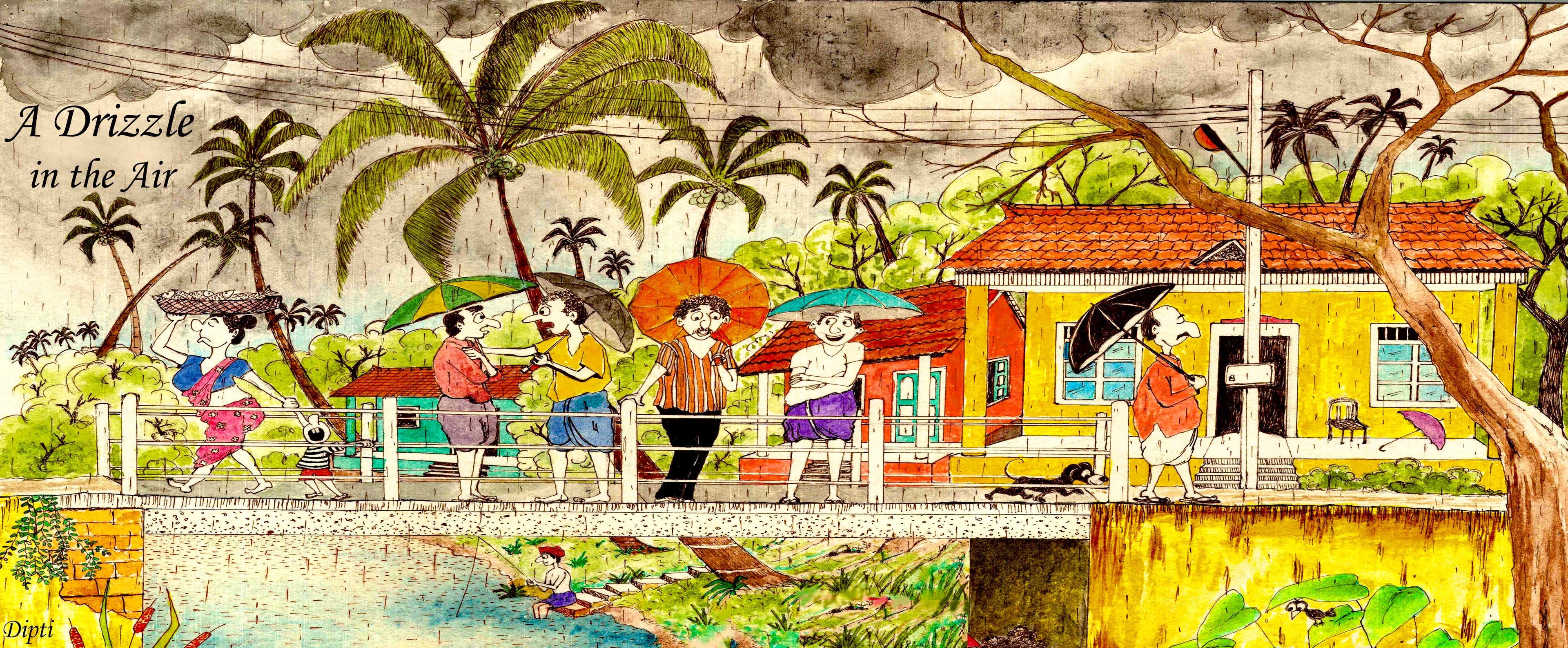 Backwaters, A serene boat ride in The Backwaters, with a light drizzle and the local community going about their daily life.